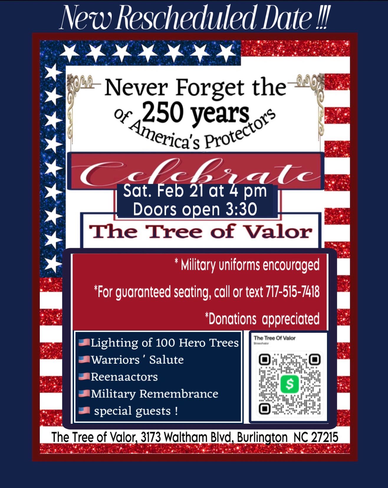 Welcome to our America 250 kickoff event! Honoring our nation’s protectors! Lighting of 100 Trees of Valor, Warriors Salute, storytelling, & treats. Please call for guaranteed seating. 717-515-7418.n